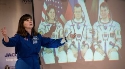 Former NASA astronaut Catherine “Cady” Coleman talked about her two Space Shuttle missions. Selected in the early 1990s to join the NASA Astronaut Corps, Coleman spent 180 days in space. Now a retired Air Force colonel and professional speaker, Coleman dazzled an audience of children and adults alike with her stories from space, showing video of how gummy bears and drops of water — both brought to space for experimentation float in zero gravity. A special thank you to Brian Talbot and CASIS for helping arrange for Coleman to speak at the Symposium.