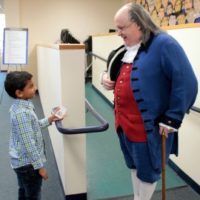 Ben Franklin impersonator talks with a young event attendee