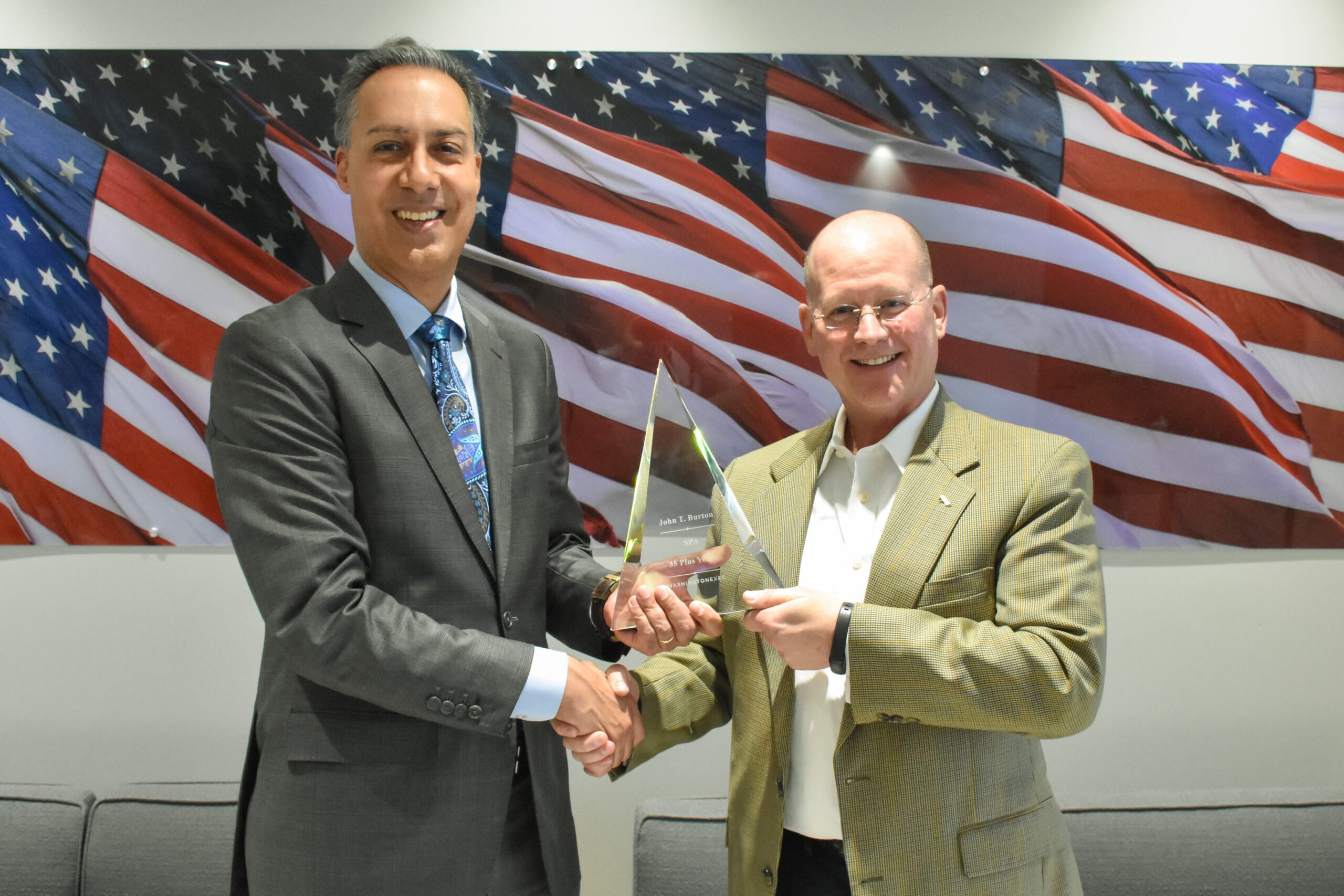 WashingtonExec’s JD Kathuria presents SPA’s John Burton with a Longevity Award.